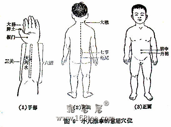 小儿推拿的常用穴位(图6及表)。